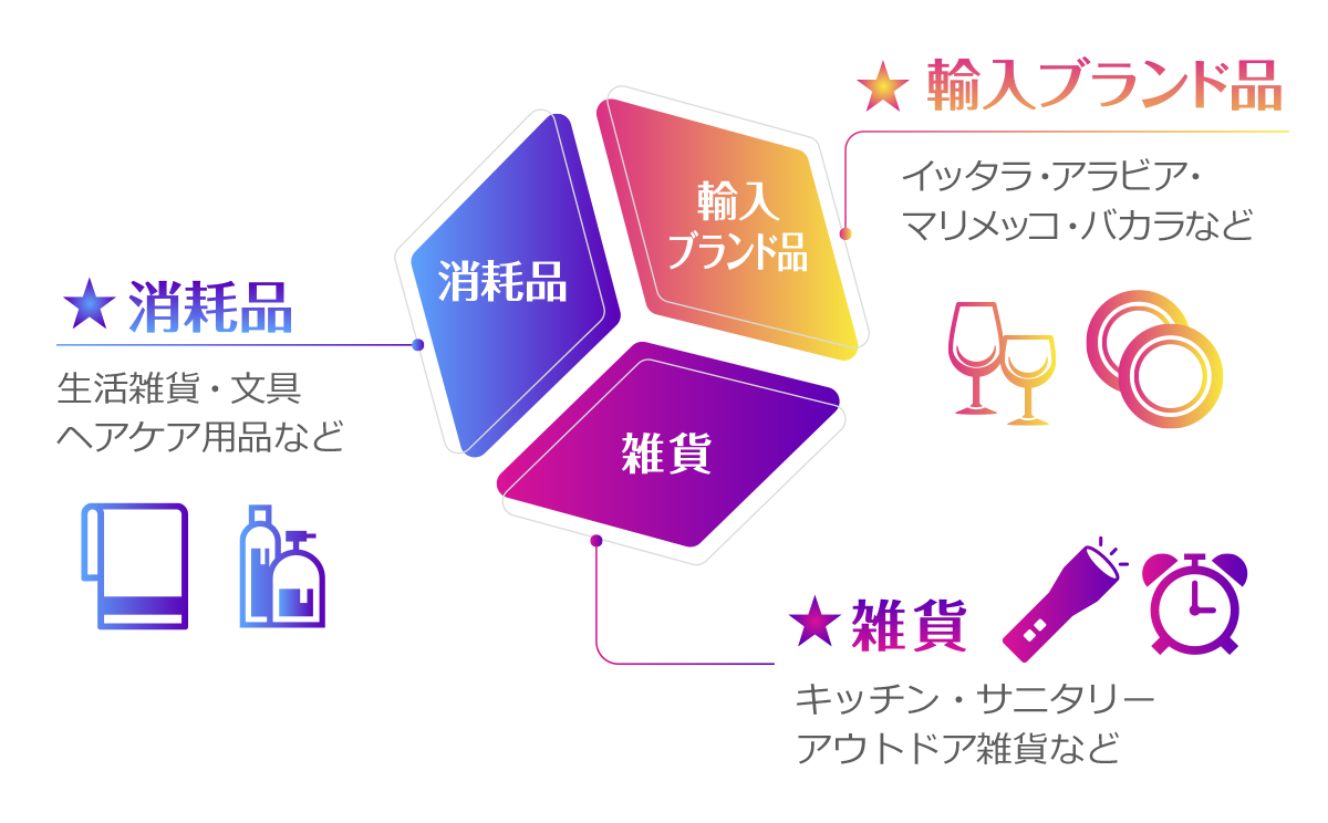 キッチン、サニタリー、ファンシー、生活雑貨、ステーショナリー、アウトドア用品などの雑貨や消耗品、